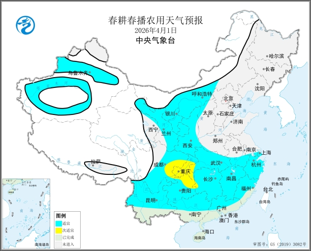 预计1日,重庆大部、四川中东部、贵州北部有小雨,春耕春播气象条件等级为次适宜(图1),全国其余春播区以晴到多云天气为主,春耕春播气象条件等级为适宜。