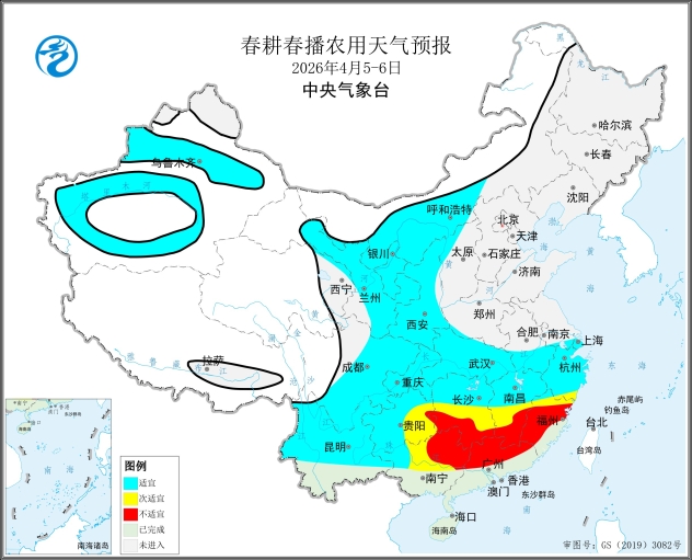 预计5-6日,湖南南部、江西南部、贵州东部、广西北部、广东北部、福建大部等地有小到中雨,局地大到暴雨,春耕春播气象条件等级为次适宜至不适宜(图4),全国其余春播区春耕春播气象条件等级为适宜。