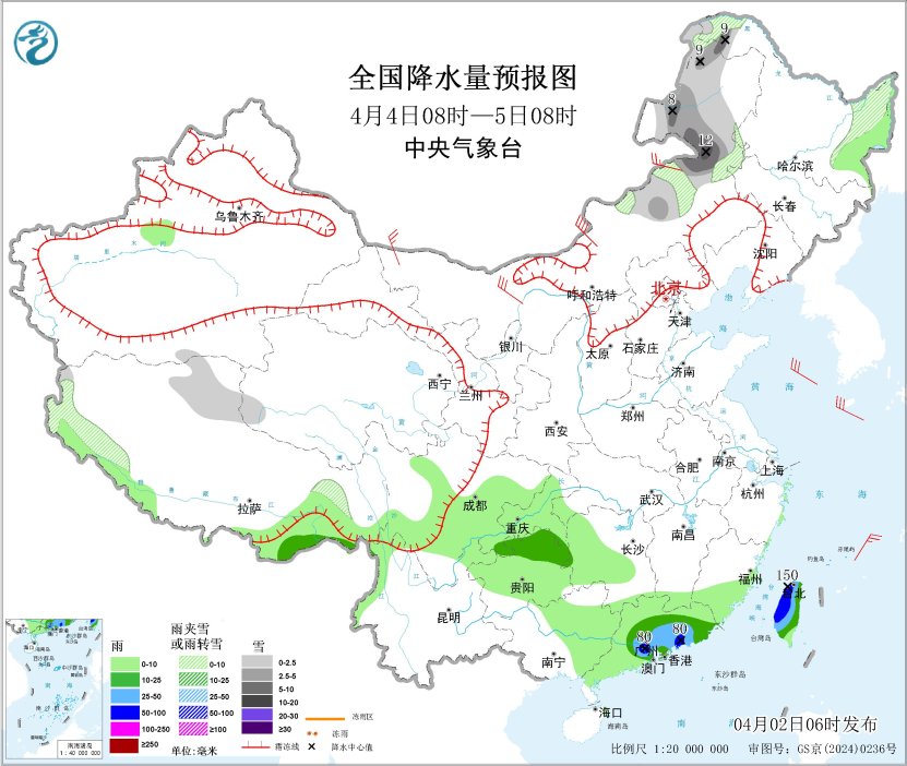 4月2日08时至3日08时,内蒙古中部、甘肃河西、青海北部和南部、西藏北部和西部、川西高原北部等地部分地区有小雪或雨夹雪,其中,川西高原北部、内蒙古中部等地部分地区有中到大雪(5~9毫米)。贵州中东部、重庆东南部、湖南、湖北东南部、江西大部、浙江西南部、福建西北部、广西东北部、广东西北部、西藏东南部等地部分地区有中到大雨,其中,湖南西部和南部、江西中部和东北部、广西东北部、广东西北部等地局地有暴雨或大暴雨(100~120毫米)。新疆东部和南疆盆地、内蒙古大部、甘肃中西部、宁夏北部、青海大部、西藏北部、云南东部等地部分地区有4~6级风、阵风7级,内蒙古中西部、甘肃河西、西藏北部、青海北部等地部分地区有7~8级风、阵风9级(见图4)。