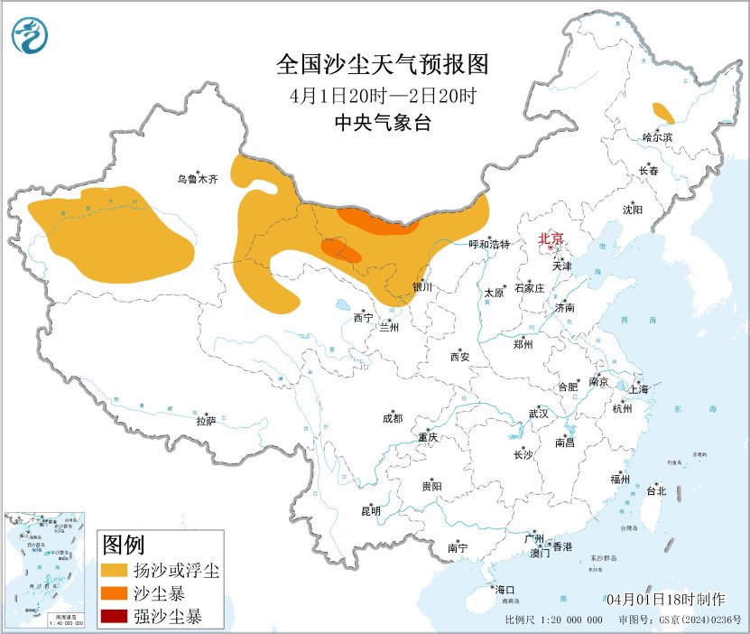 图1 全国沙尘天气预报图(4月1日20时-2日20时)