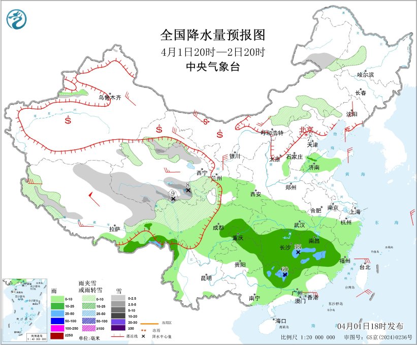 4月1日20时至2日20时,内蒙古中东部、黑龙江西部、西藏西部和东部、青海北部和南部、甘肃河西和南部、川西高原北部等地部分地区有小到中雪或雨夹雪,其中,青海南部等地部分地区有大雪(5~9毫米);西藏东南部、西南地区东部、江南大部、广西东北部、广东西北部等地部分地区有中到大雨,其中,湖南南部和东部、江西西部、广西东北部、广东西北部等地局地有暴雨(50~60毫米)。新疆东部和南疆盆地、内蒙古大部、甘肃中西部、宁夏北部、青海大部、西藏北部、云南东部等地部分地区有4~6级风、阵风7级,内蒙古中西部、甘肃河西、西藏北部、青海北部等地部分地区有7~8级风、阵风9级(见图3)。