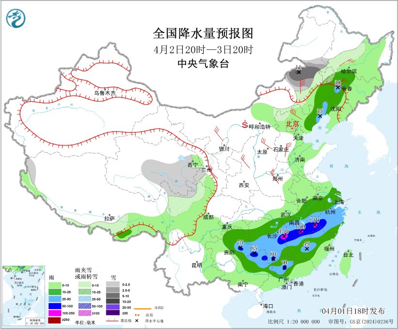 4月2日20时至3日20时,青海东部、内蒙古东部、黑龙江中部、吉林西部、川西高原北部等地部分地区有小到中雪或雨夹雪,其中,内蒙古东北部局地有大到暴雪(10~11毫米);吉林中部、辽宁西部和北部、江南大部、华南北部、贵州中东部等地部分地区有中到大雨,其中,贵州东部、湖南东部、江西中北部、浙江西南部、福建西北部、广西北部、广东北部等地部分地区有暴雨或大暴雨(100~150毫米)。新疆东部、内蒙古大部、西北地区中东部、华北、山东北部、东北地区中南部等地部分地区有4~6级风、阵风7~9级,内蒙古中部、山西北部、河北北部、北京西部等地局地阵风可达10级以上;渤海、渤海海峡、黄海北部海域、东海大部海域、台湾海峡将有7~8级风、阵风9级(见图4)。