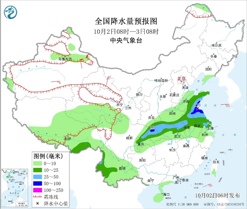 昨日,较强降雨主要出现在华西至黄淮一带,其中,四川东北部、陕西南部、重庆北部、湖北西部、河南东部、山东西南部、安徽北部等地出现暴雨,局地大暴雨。预计今天,雨带东段将东移南压,四川东北部、重庆北部、陕西东南部、湖北北部、河南南部、山东东部和南部、安徽北部、江苏北部等地将有大到暴雨,其中,江苏北部局地大暴雨(100~110毫米)。上述部分地区并伴有短时强降水、雷暴大风等强对流天气。