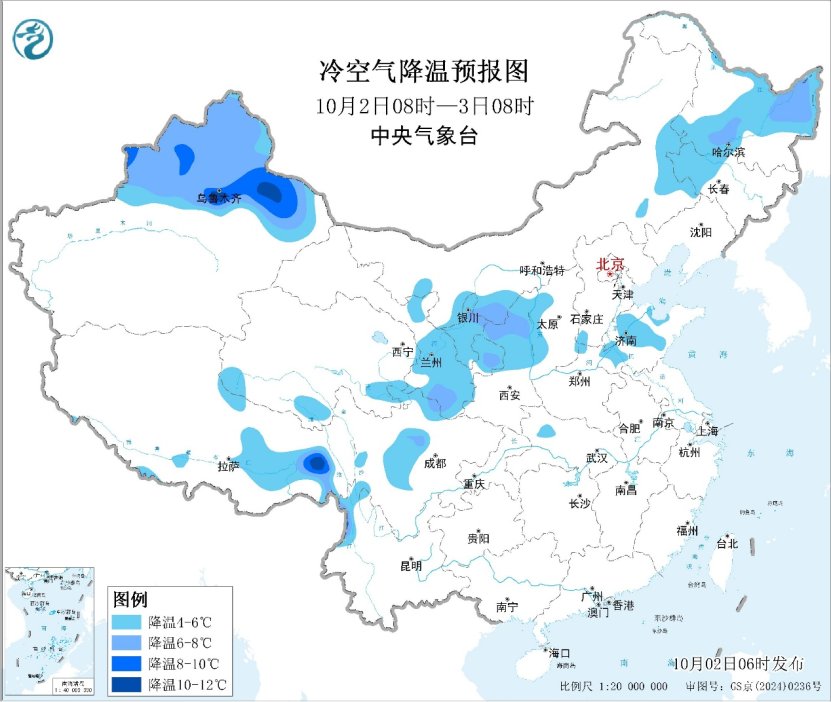 在气温上,今晨,新疆北部、甘肃东部、宁夏、内蒙古东北部、黑龙江大部等地出现4~8℃的降温,局地降温幅度超过10℃。预计未来三天,冷空气将继续影响新疆、内蒙古、黑龙江等地,上述地区气温将下滑4~8℃,局地10℃以上;并伴有4~6级偏北风,新疆山口地区风力可达9~11级,南疆盆地部分地区有扬沙或浮尘天气;黑龙江西北部、新疆西北部高海拔地区有中到大雪或雨夹雪。